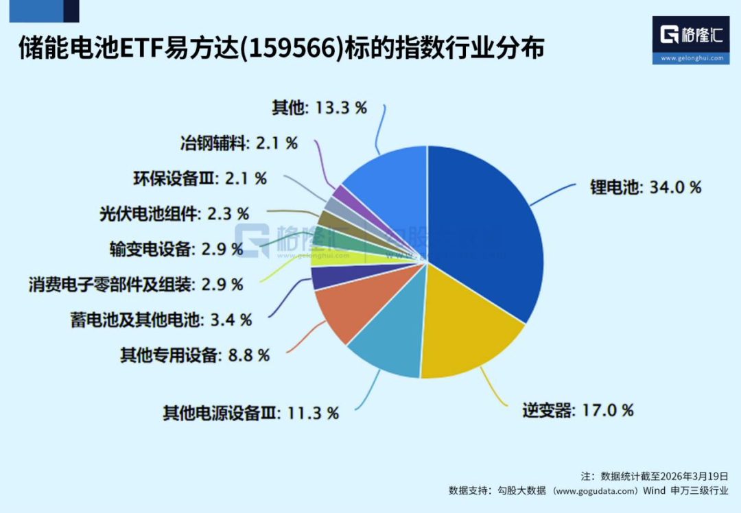 储能电池ETF易方达(159566,联接基金A/C:021033/021034),跟踪的国证新能源电池指数,聚焦电芯制造、储能系统、逆变器、液冷等核心环节,储能系统占比超70%,超过同类电池指数,权重股包括电宁德时代、亿纬锂能、英维克、阳光电源、国轩高科、德业股份等行业龙头。