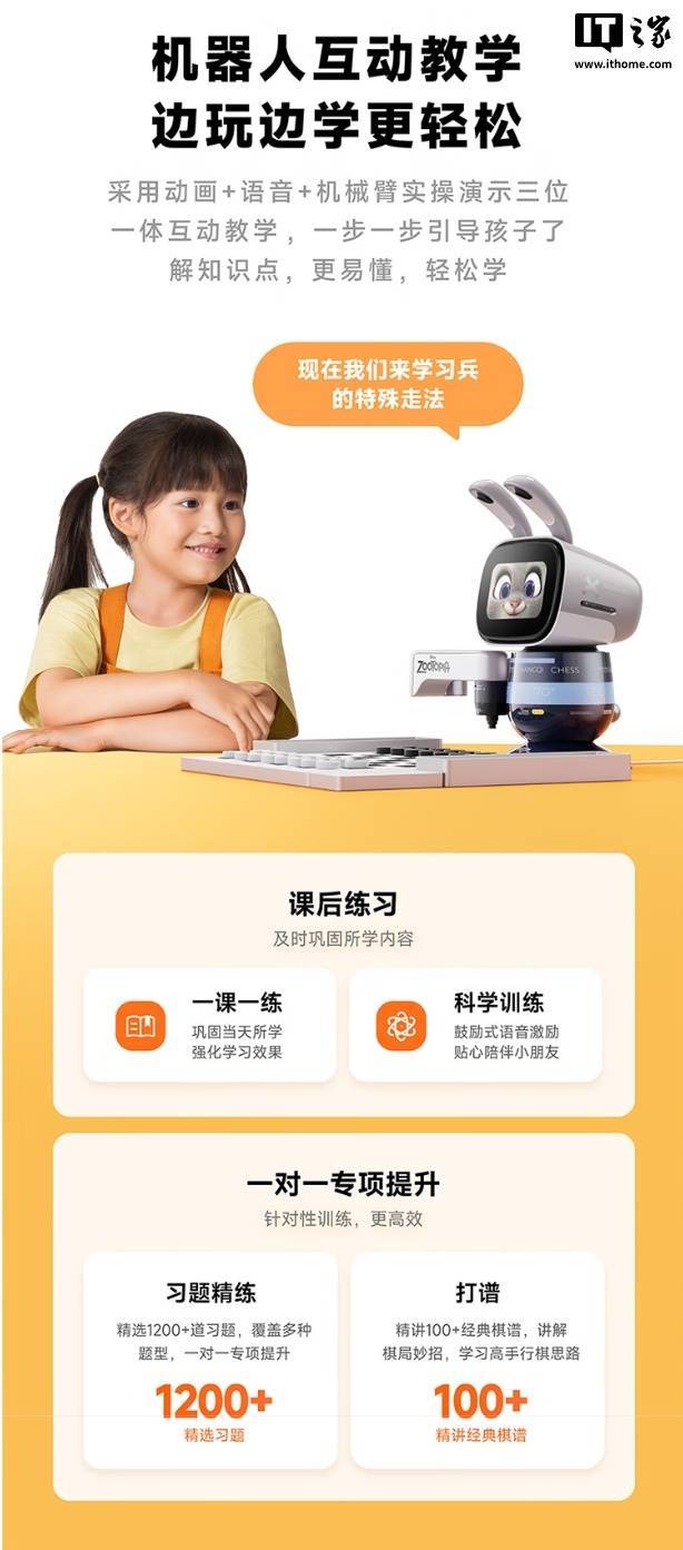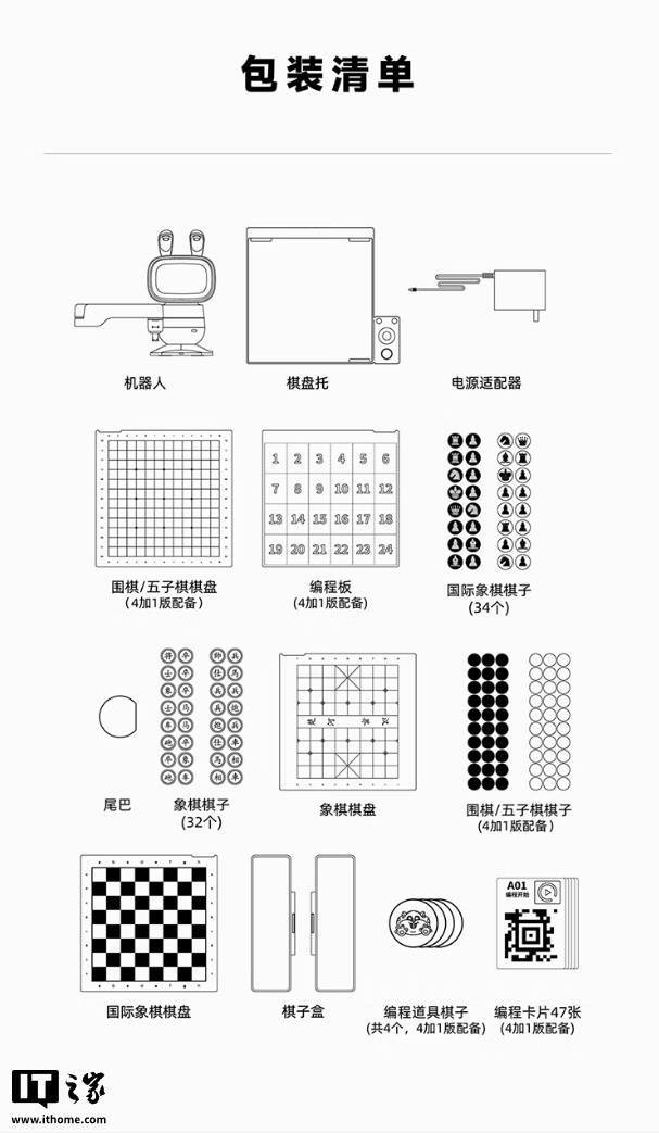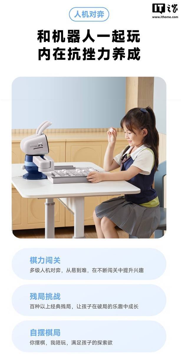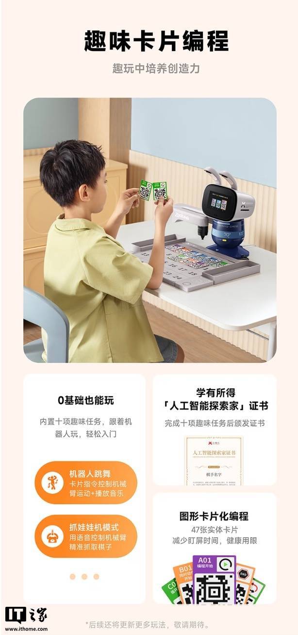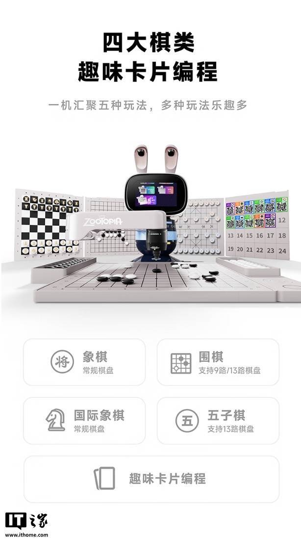 这款机器人具备学编程、下象棋、围棋、国际象棋、五子棋功能,其中编程教学使用卡片化设计,号称“0 基础也能玩”,配有 47 张实体卡片,可控制机器人跳舞,还可让机器人化身抓娃娃机,用机械臂抓取棋子。