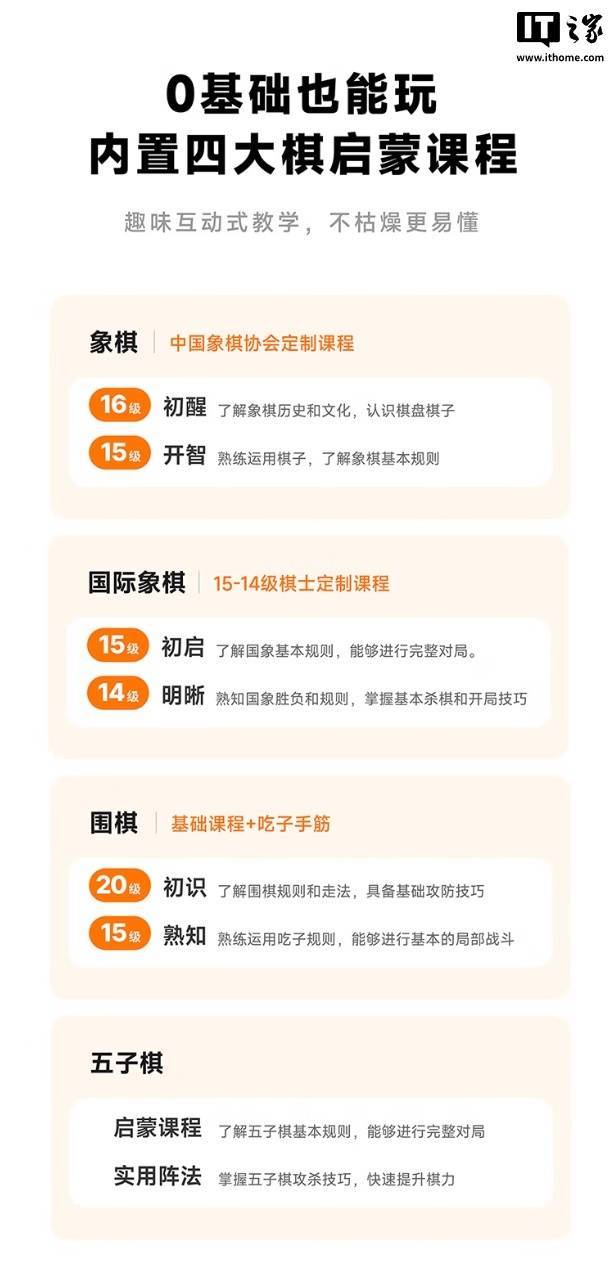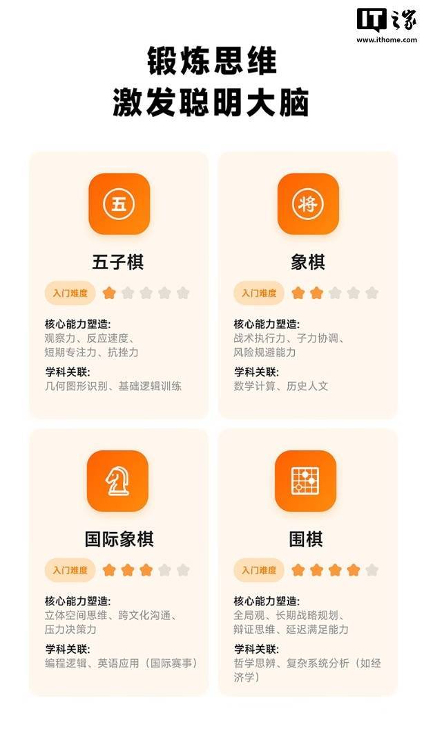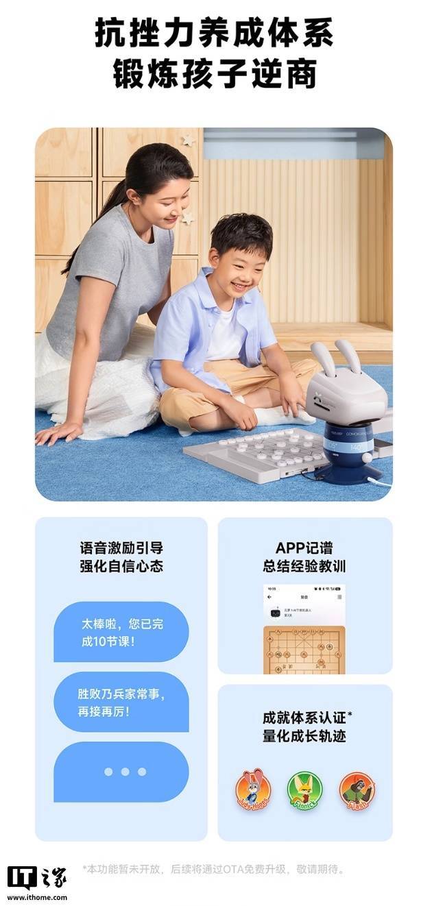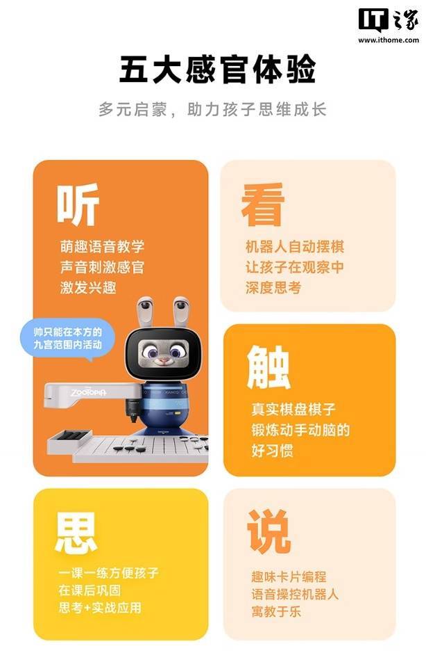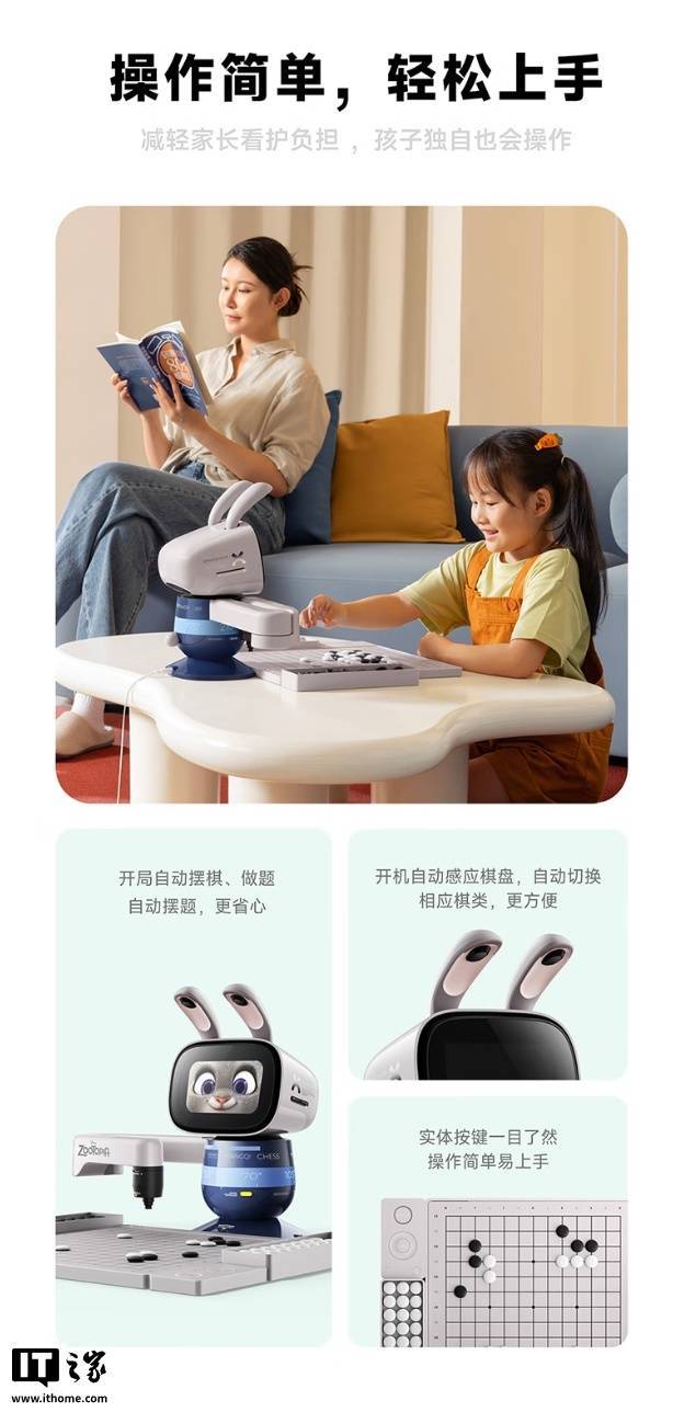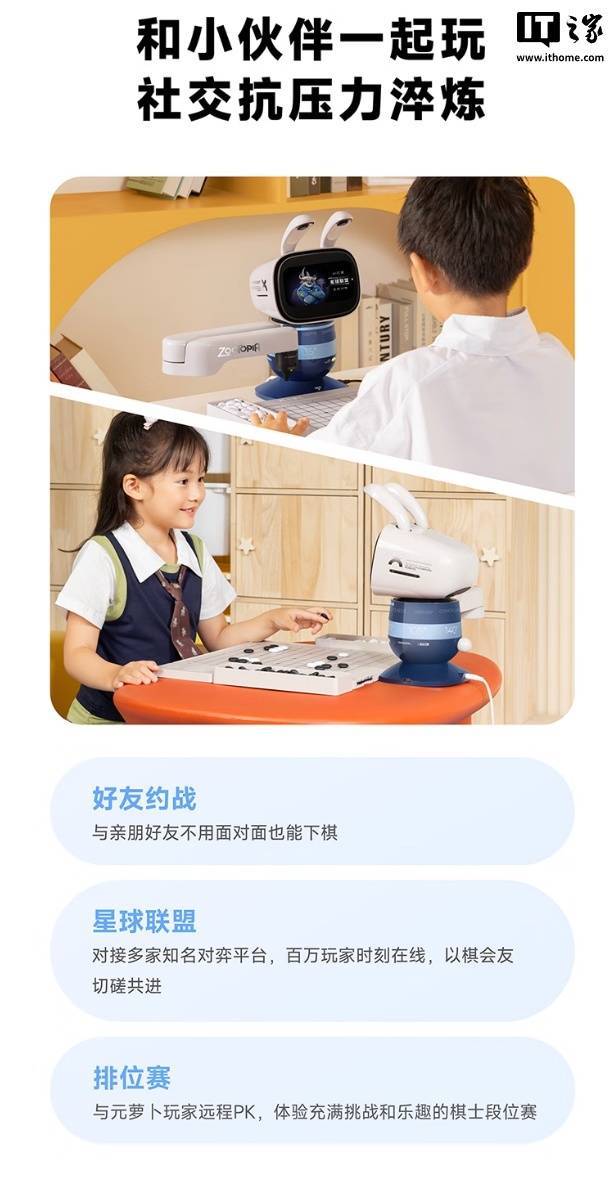 这款机器人具备学编程、下象棋、围棋、国际象棋、五子棋功能,其中编程教学使用卡片化设计,号称“0 基础也能玩”,配有 47 张实体卡片,可控制机器人跳舞,还可让机器人化身抓娃娃机,用机械臂抓取棋子。