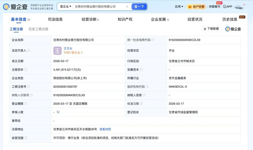 爱企查App显示,近日,甘肃农村商业银行股份有限公司成立,法定代表人为王文永,注册资本约449.2亿元人民币,经营范围为银行业务。