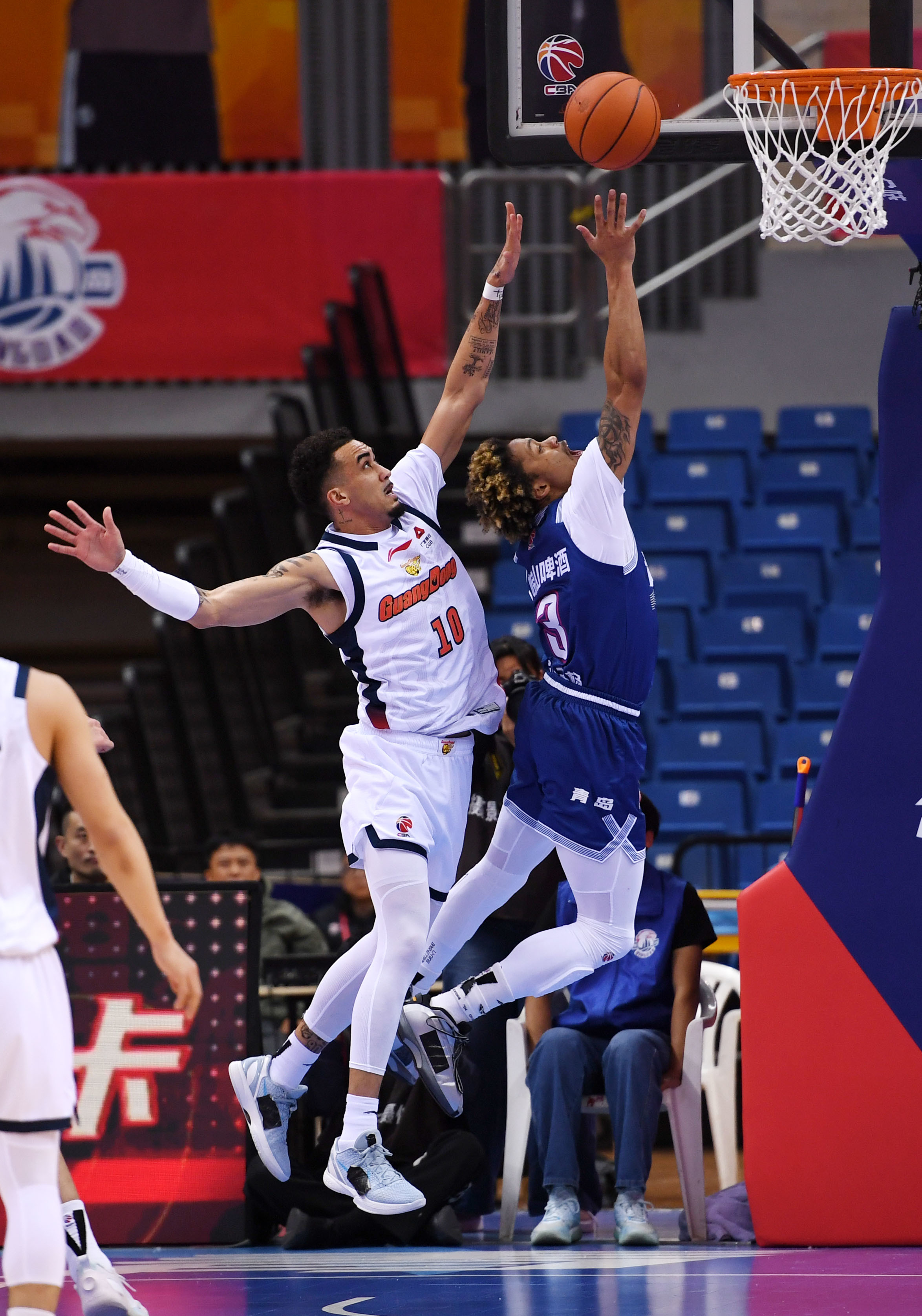 4月8日,青岛崂山啤酒队球员约瑟夫·杨(右)在广东东阳光队球员奎因的防守下上篮。新华社记者 李紫恒 摄