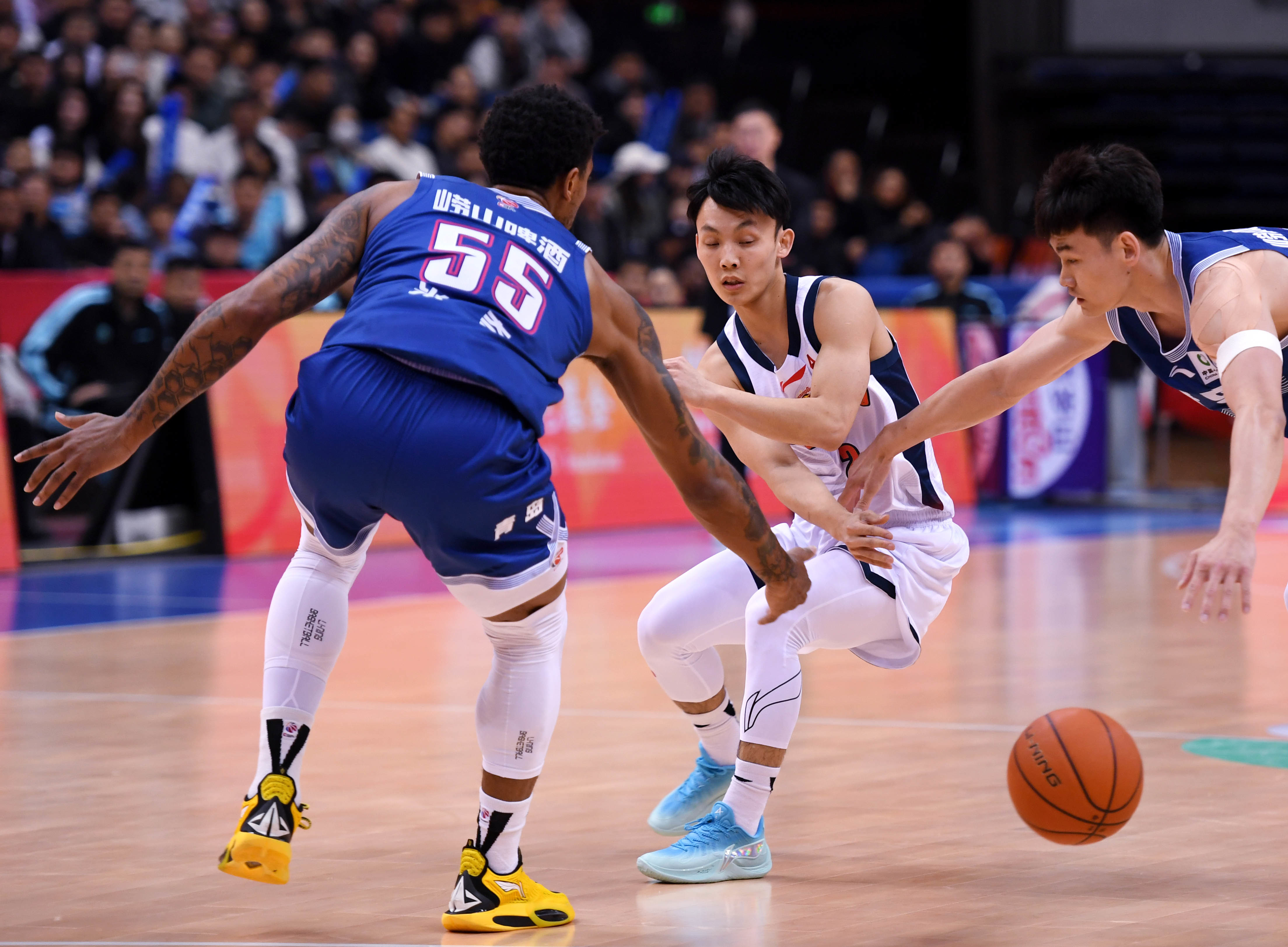 4月8日,广东东阳光队球员徐杰(中)在比赛中传球。新华社记者 李紫恒 摄