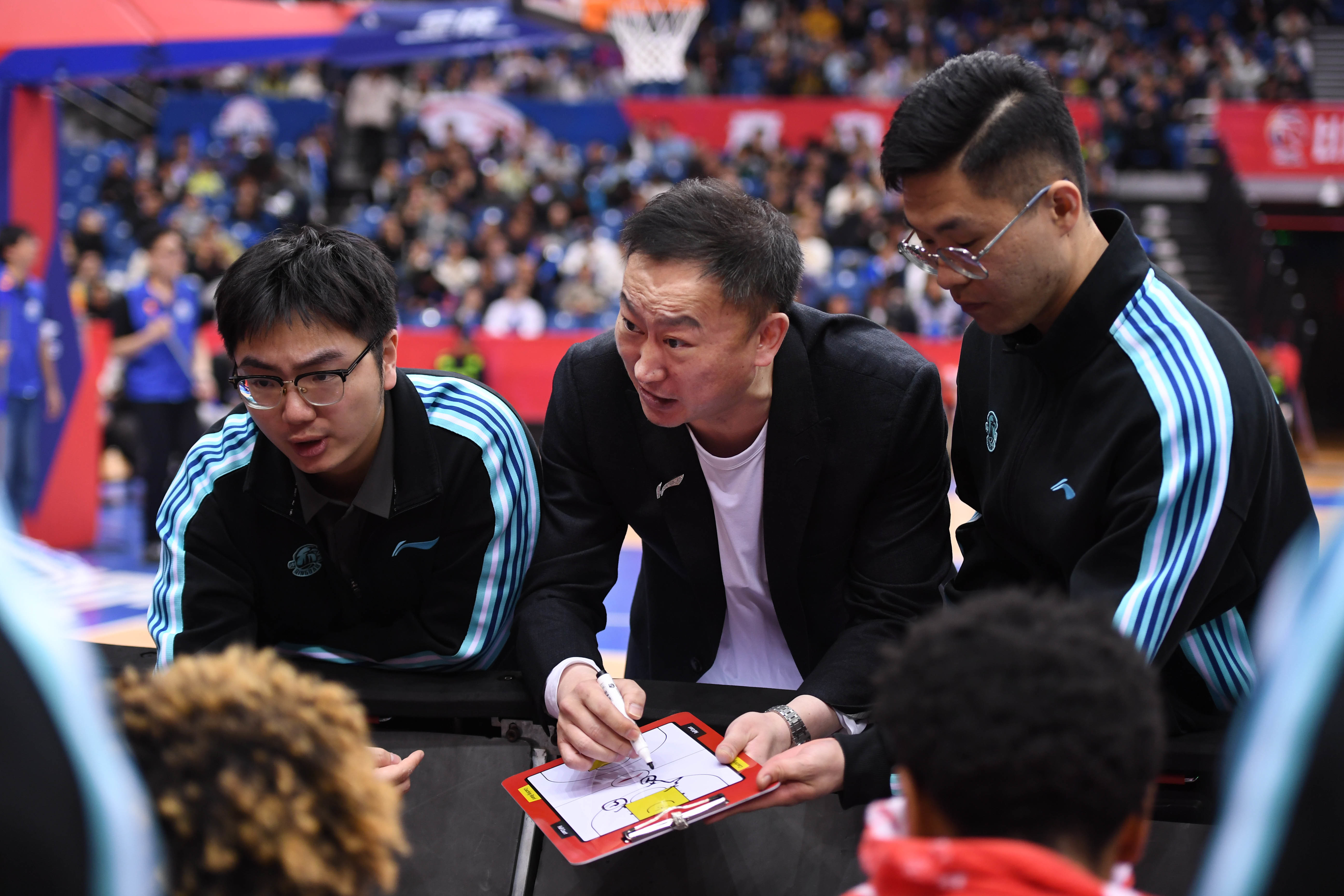 4月8日,青岛崂山啤酒队主教练刘维伟(中)在比赛暂停时布置战术。新华社记者 李紫恒 摄